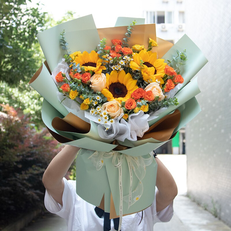 花 材:3朵向日葵,3朵香槟玫瑰,6支多头橙色、黄色混搭小玫瑰,尤加利叶装饰。