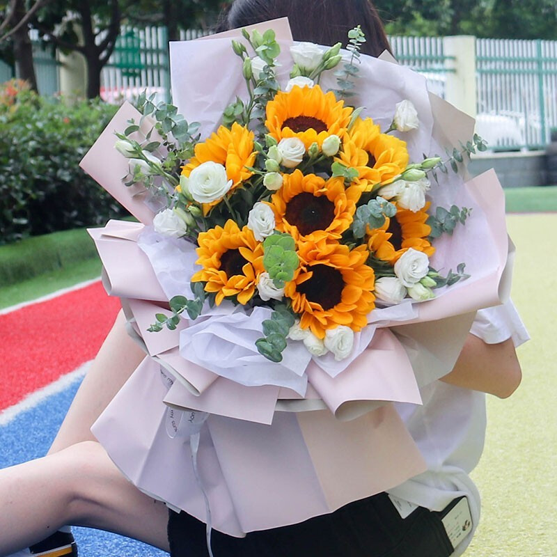 花 材:精选7朵向日葵,搭配桔梗,尤加利叶装饰。