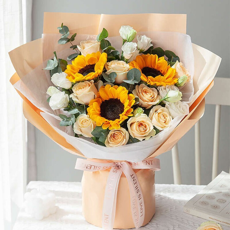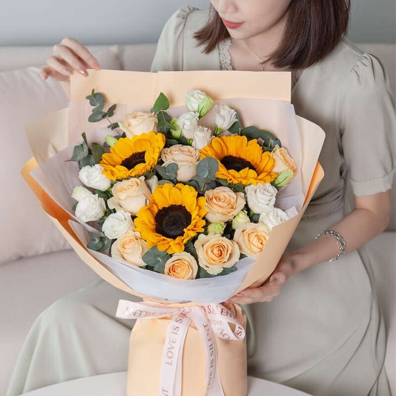花 材:3支向日葵,9朵香槟玫瑰,3支白色洋桔梗(可用3支白玫瑰代替),搭配尤加利叶装饰。
