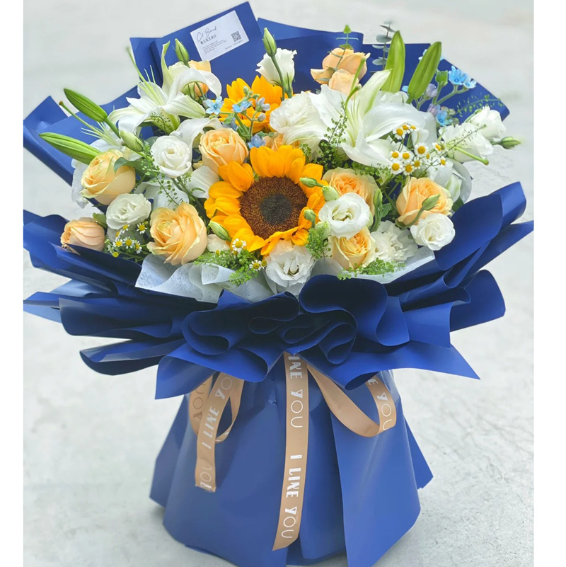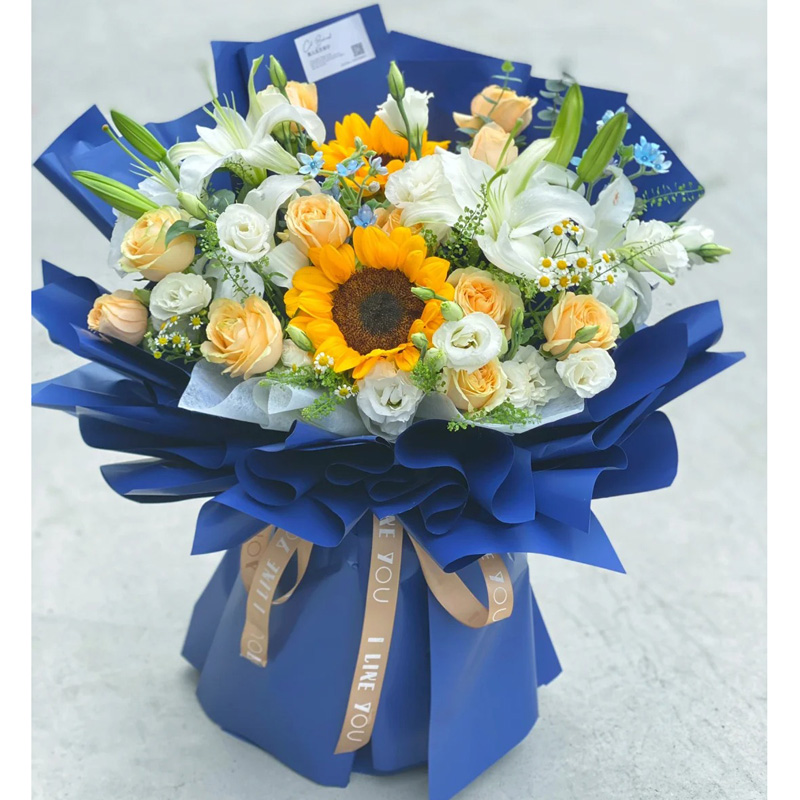 花材: 2朵向日葵,11朵香槟玫瑰,3支白色多头香水百合,搭配6支洋桔梗(断货则用同数量白玫瑰代替),洋甘菊,尤加利叶装饰。