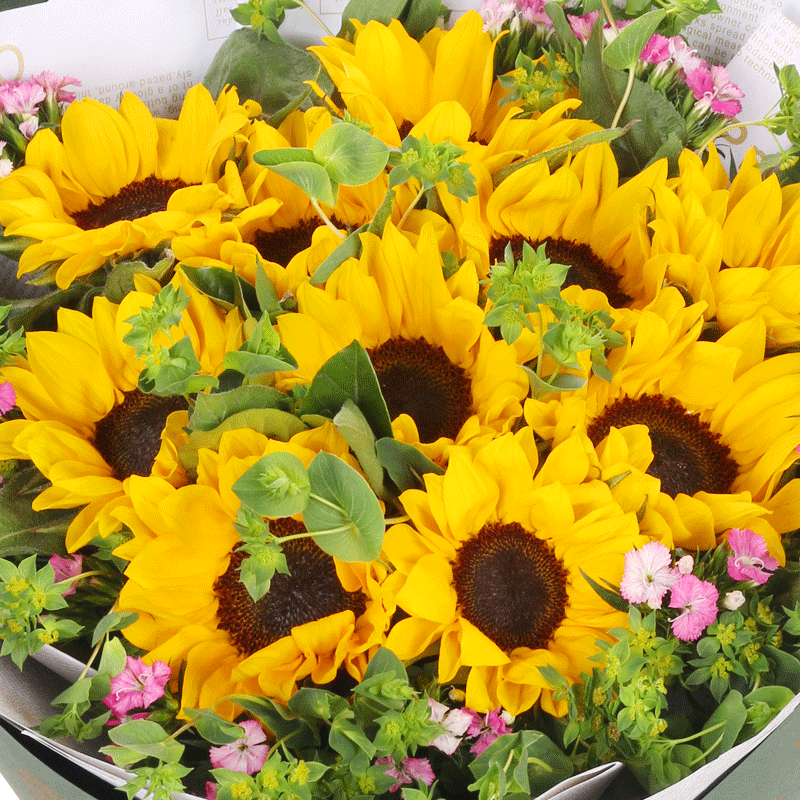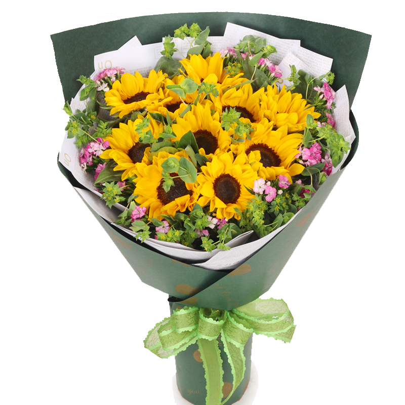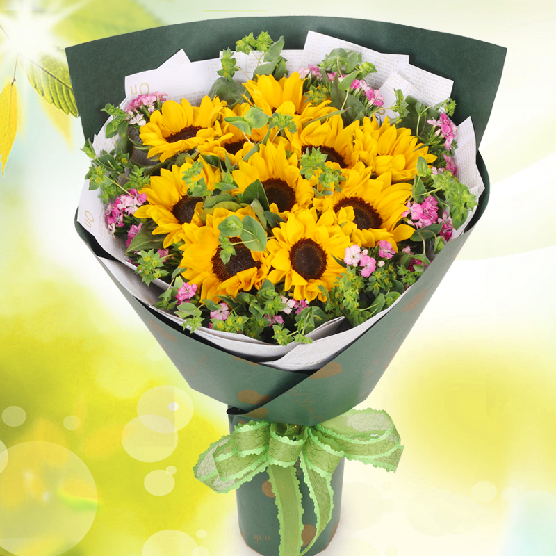 花 材:11朵精品向日葵,搭配叶上黄金、绿叶、石竹梅点缀。