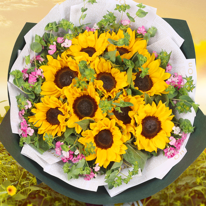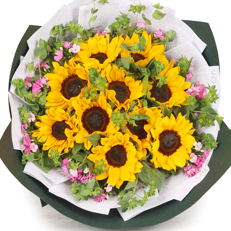 花材: 11朵精品向日葵,搭配叶上黄金、绿叶、石竹梅点缀。