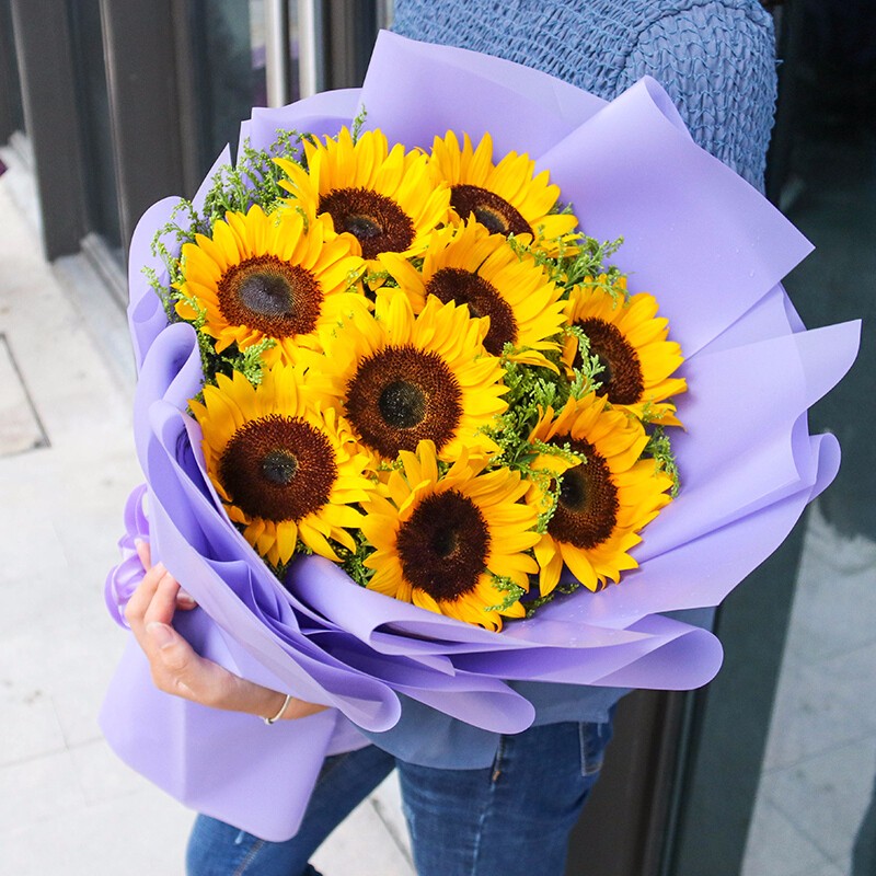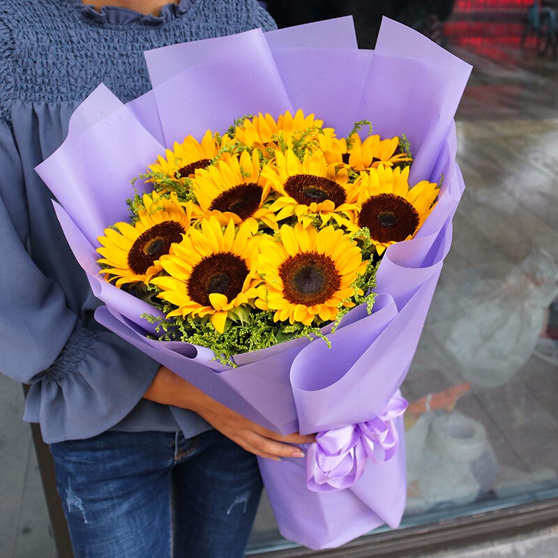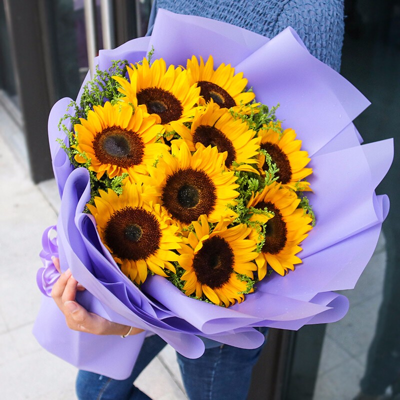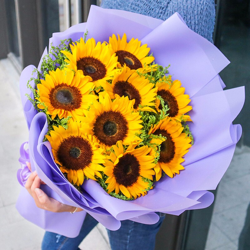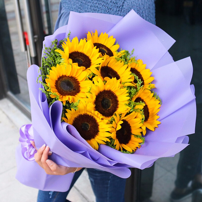 花材: 精选9支向日葵,搭配黄莺丰满间插。
