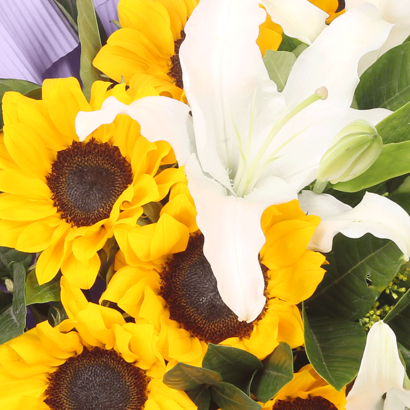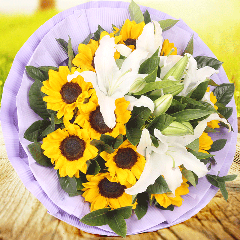 花 材:11支精品向日葵,3支多头白色香水百合,栀子叶点缀。