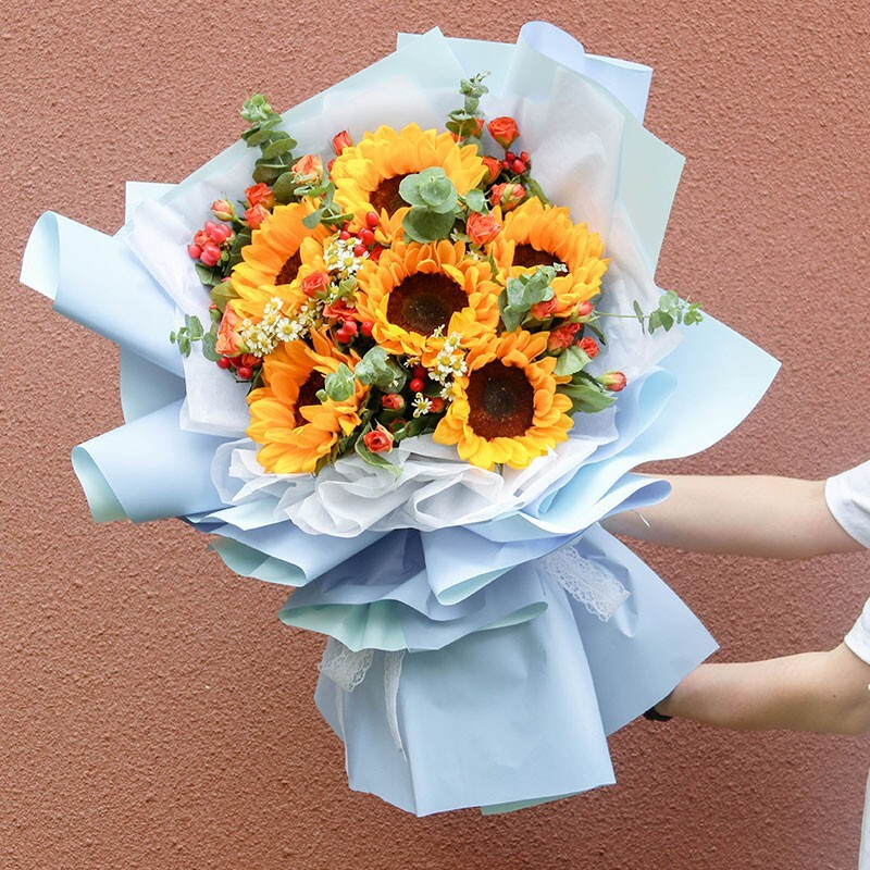 花材: 6枝向日葵,搭配红豆、尤加利叶,洋甘菊,多头橙色小玫瑰装饰。