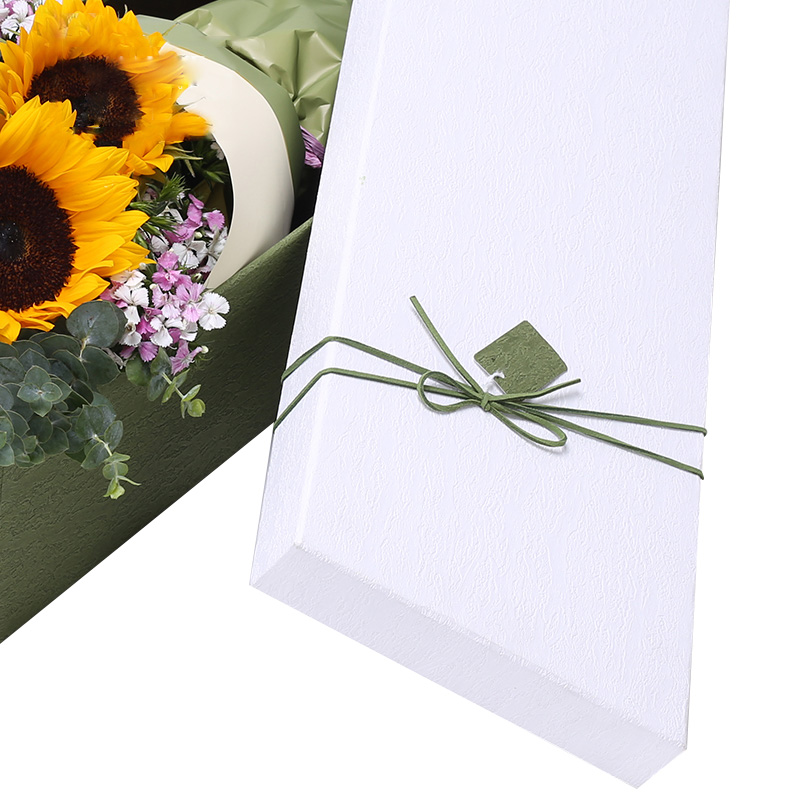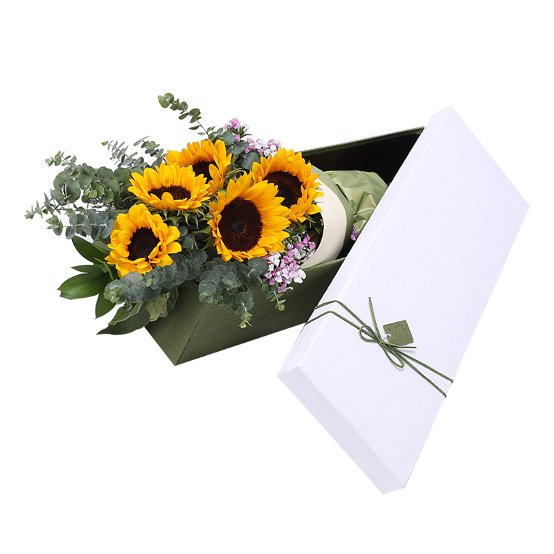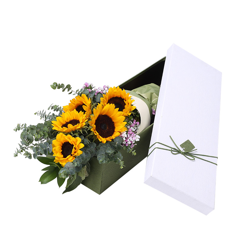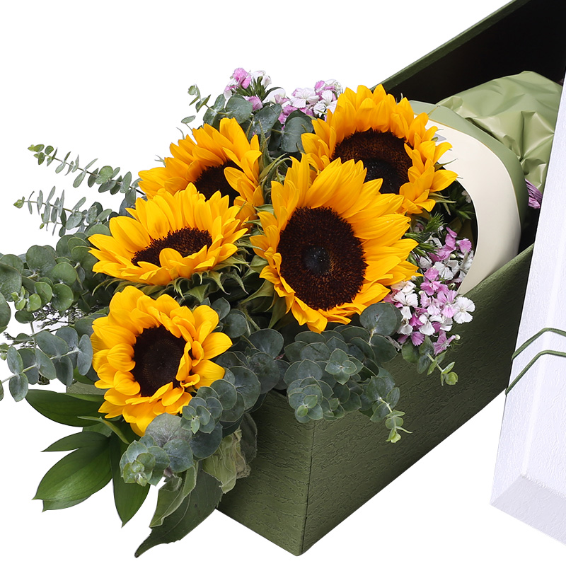 花 材:5支精品向日葵,搭配适量尤加利、石竹梅装饰。