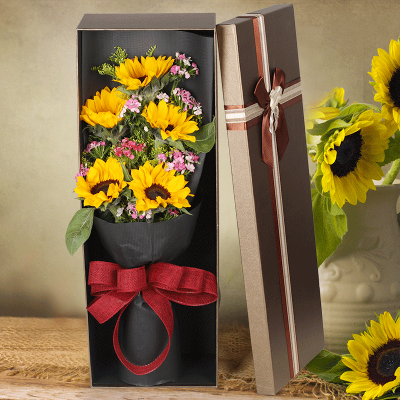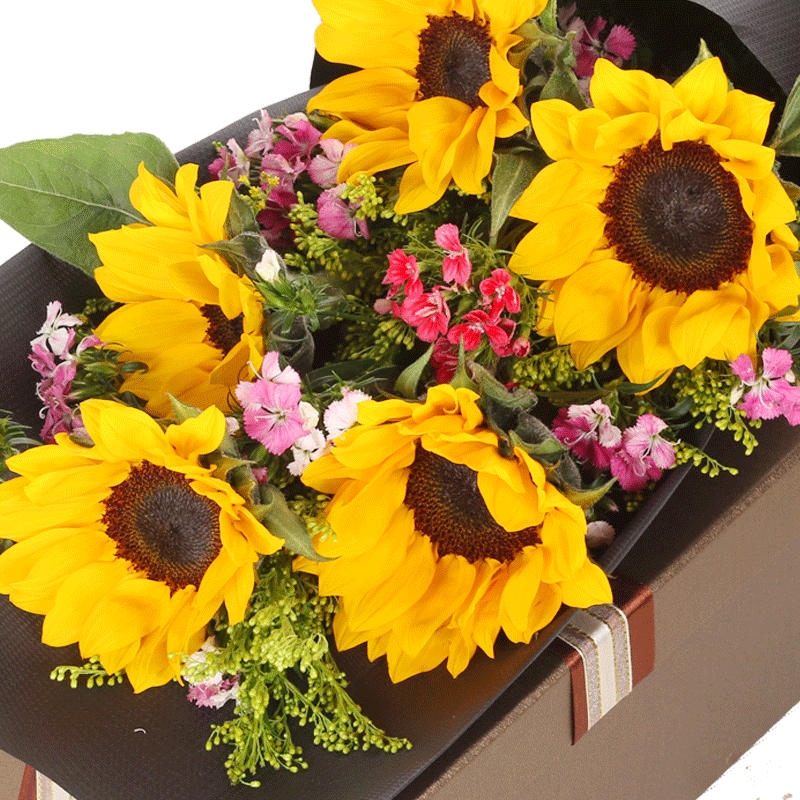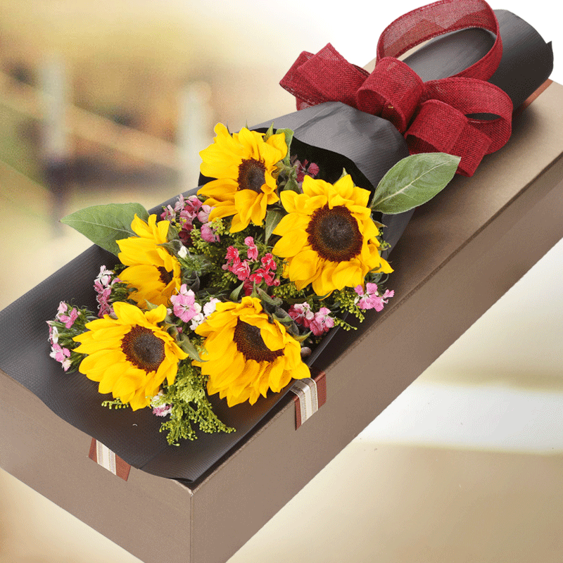 花材: 5支向日葵,搭配黄莺、绿叶、石竹梅点缀。