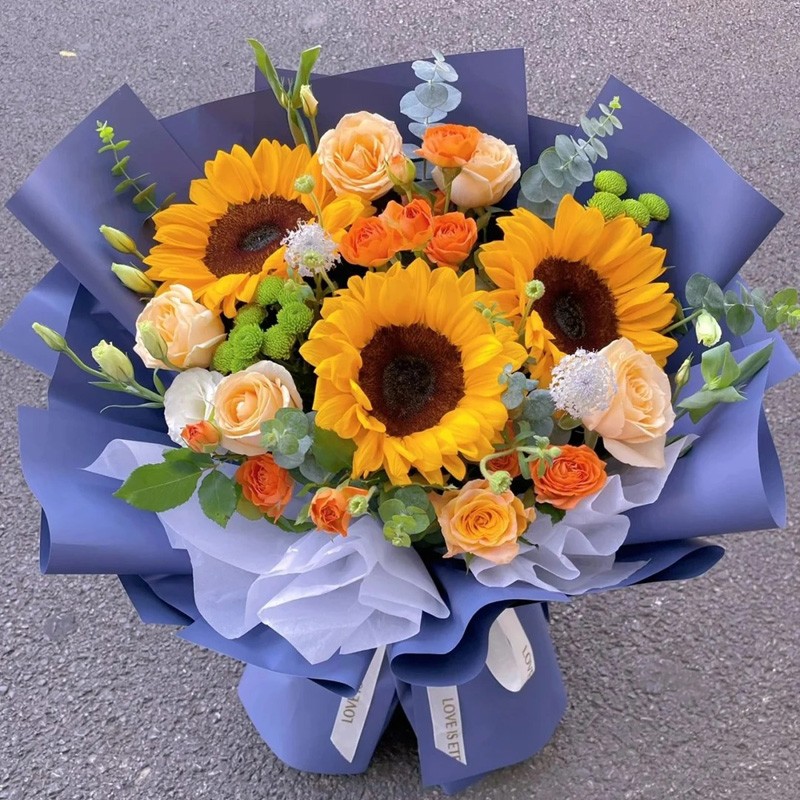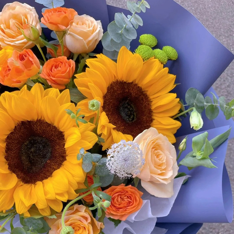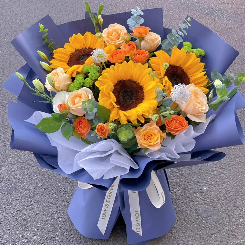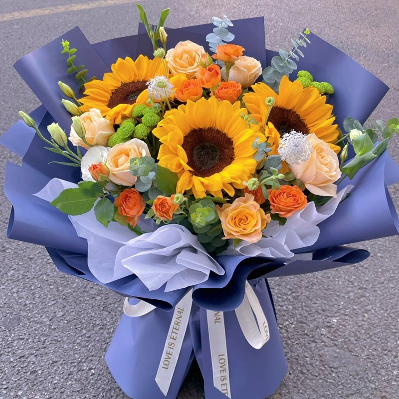 花 材:3朵向日葵,6朵香槟玫瑰,搭配3支多头橙色小玫瑰,2支洋桔梗,小雏菊,尤加利叶装饰。