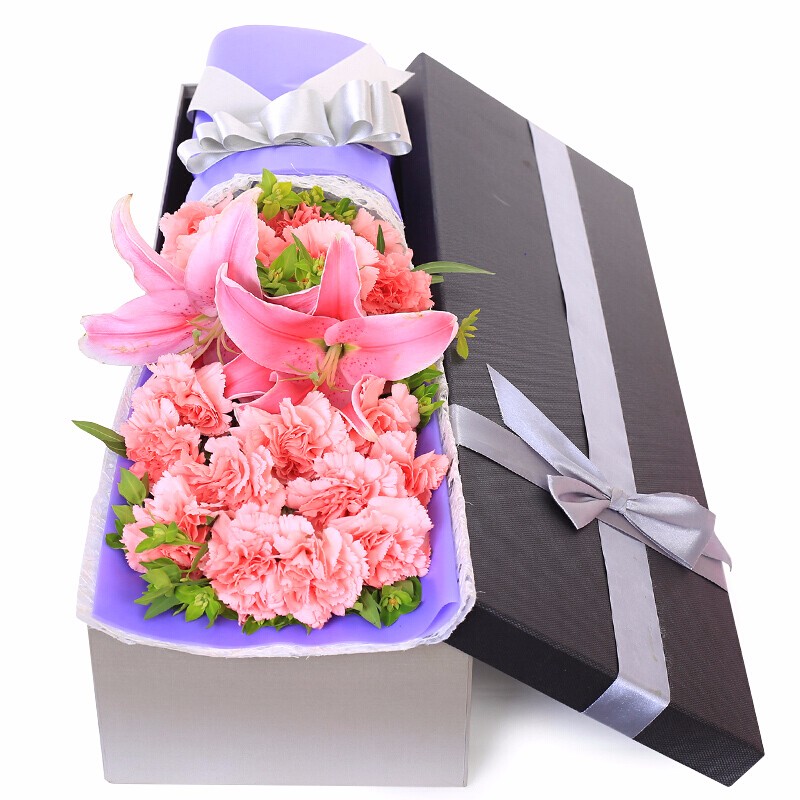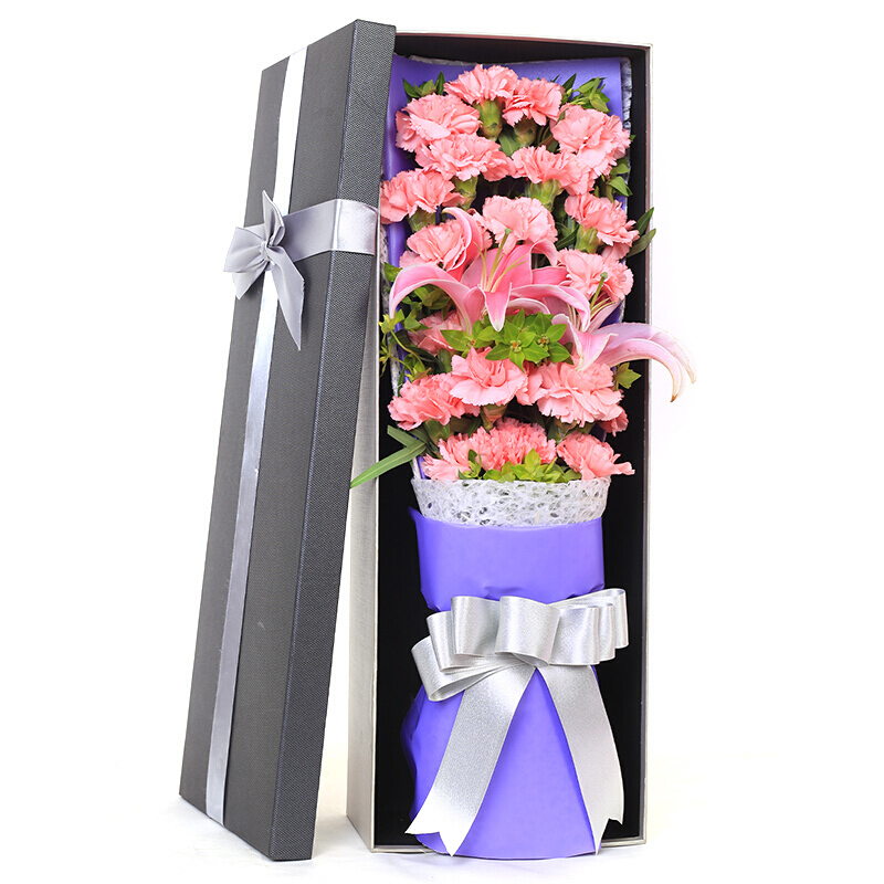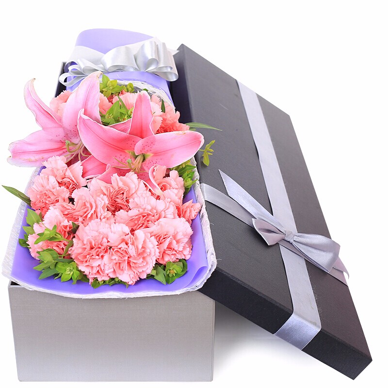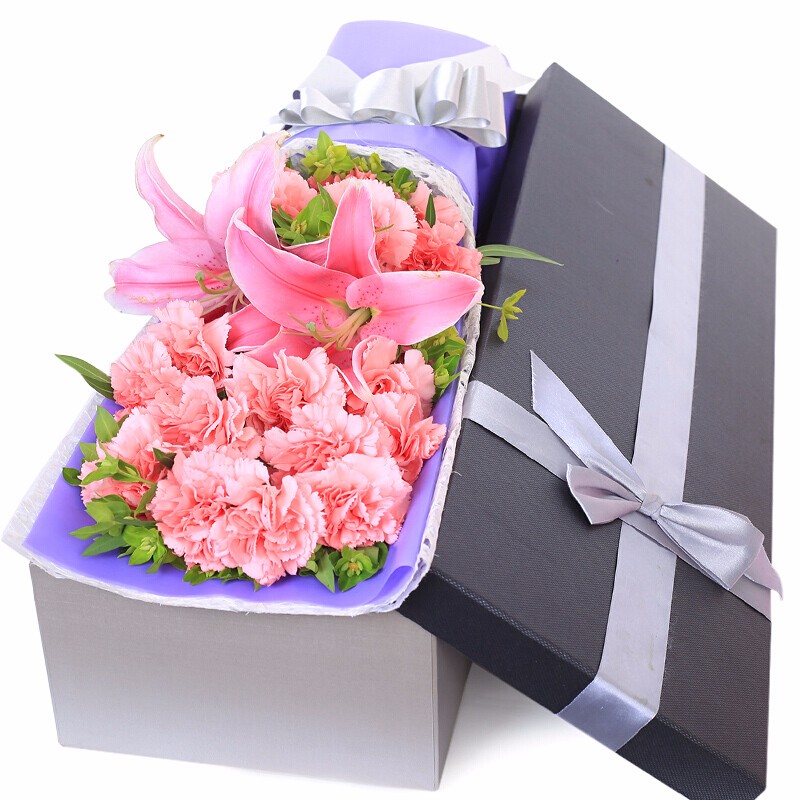 花材: 精选19朵粉色康乃馨,1支多头粉百合,搭配叶上黄金、丝带草装饰。