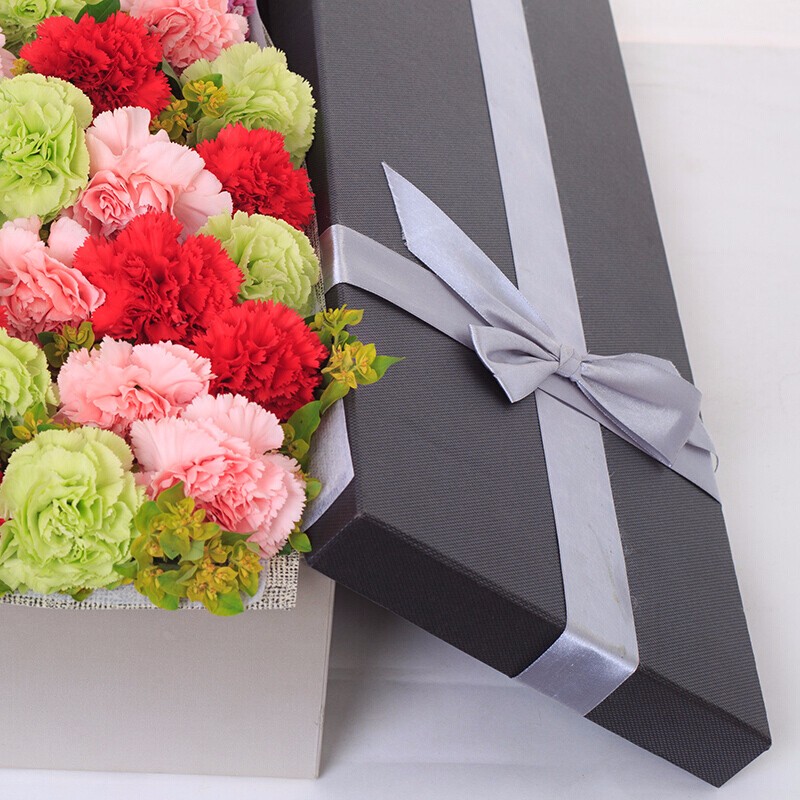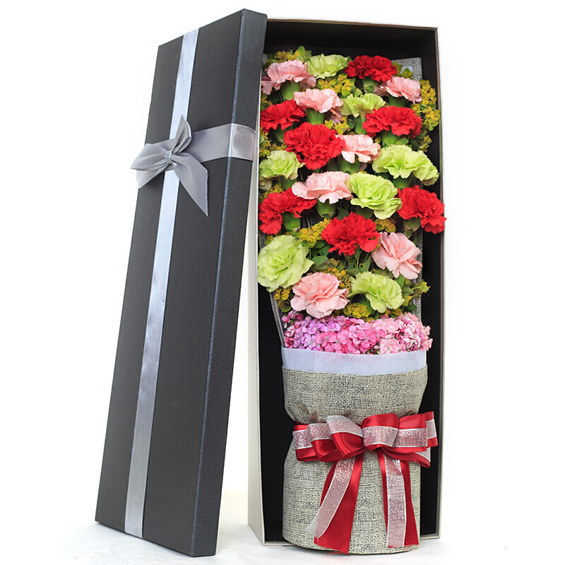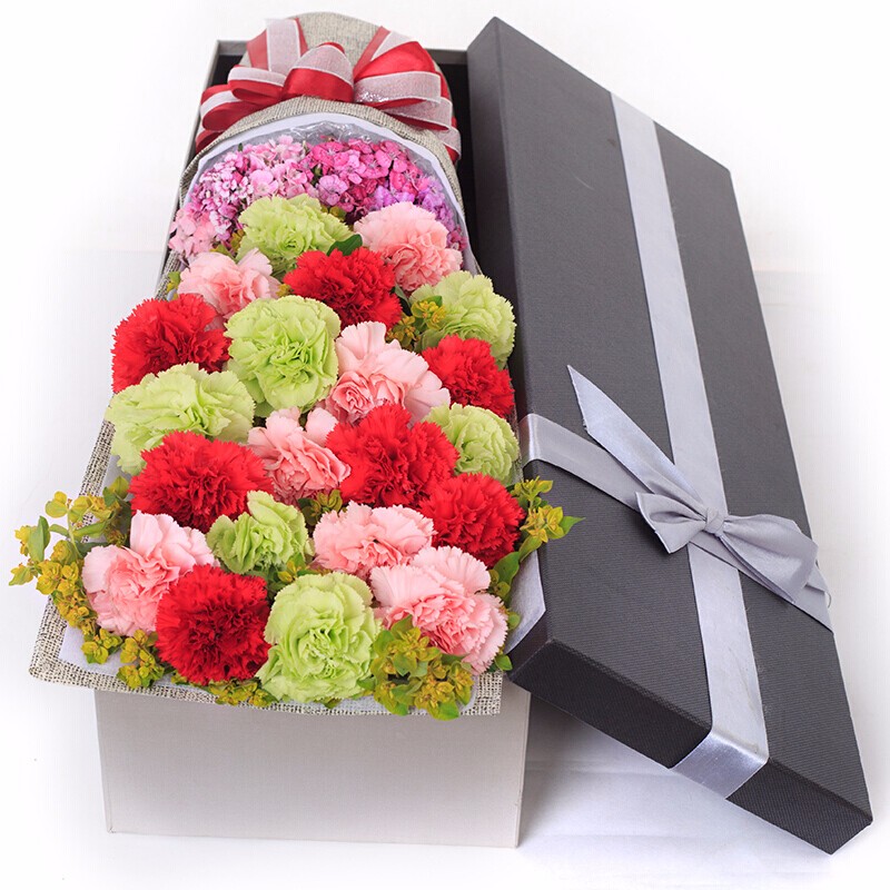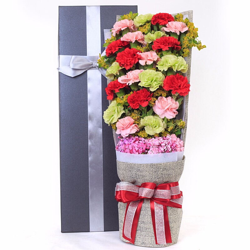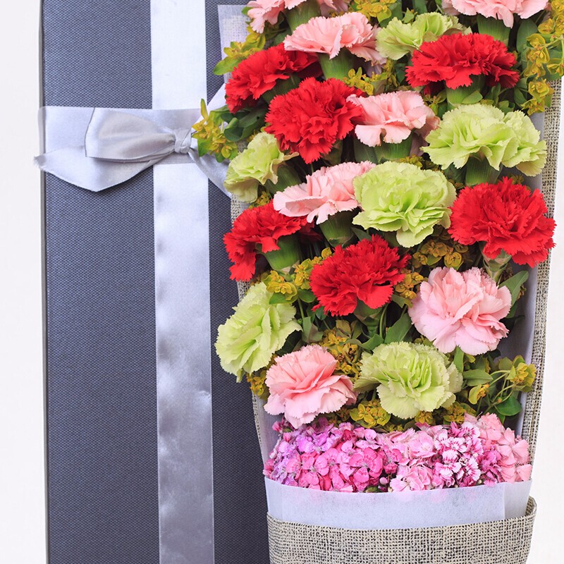 花 材:21朵混色康乃馨(7朵粉色、7朵红色、7朵粉色),搭配也上黄金、石竹梅点缀。