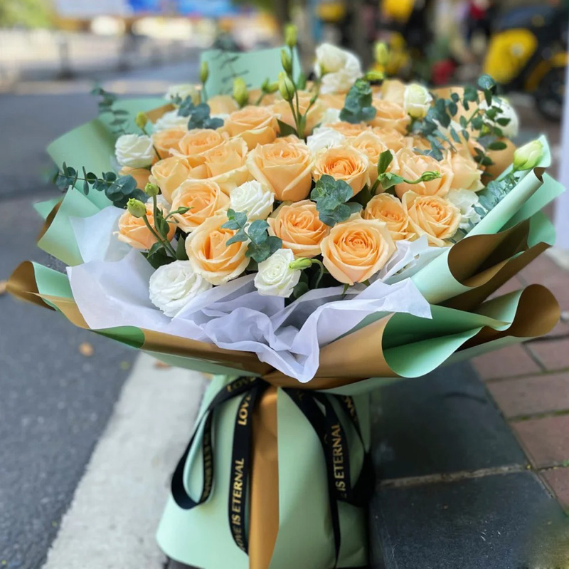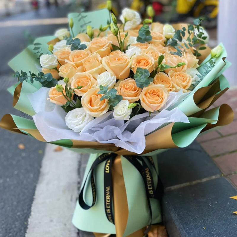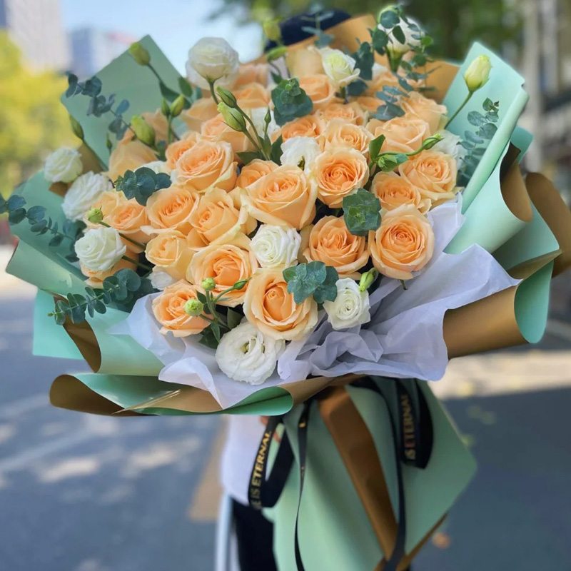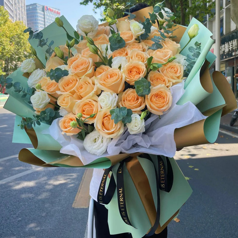 花材: 33朵香槟玫瑰,8支洋桔梗(断货则用同数量白玫瑰代替),搭配尤加利叶装饰。
