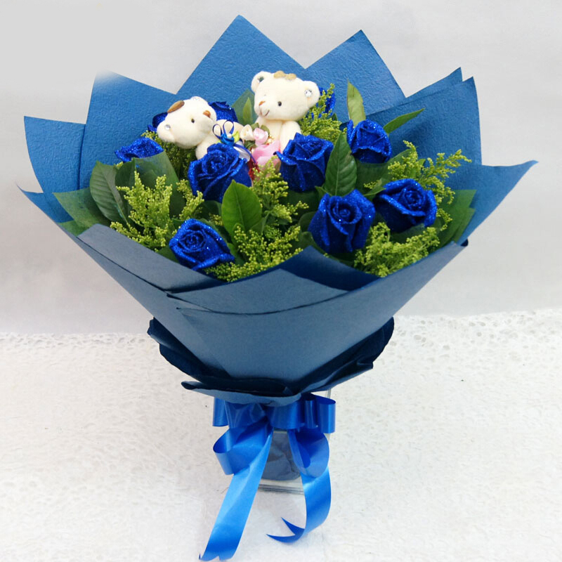 花 材:精选9支蓝玫瑰,2只小熊公仔,搭配黄莺装饰。