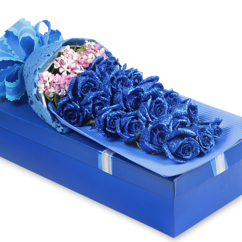 花 材:19朵精品蓝色妖姬,搭配石竹梅装饰。