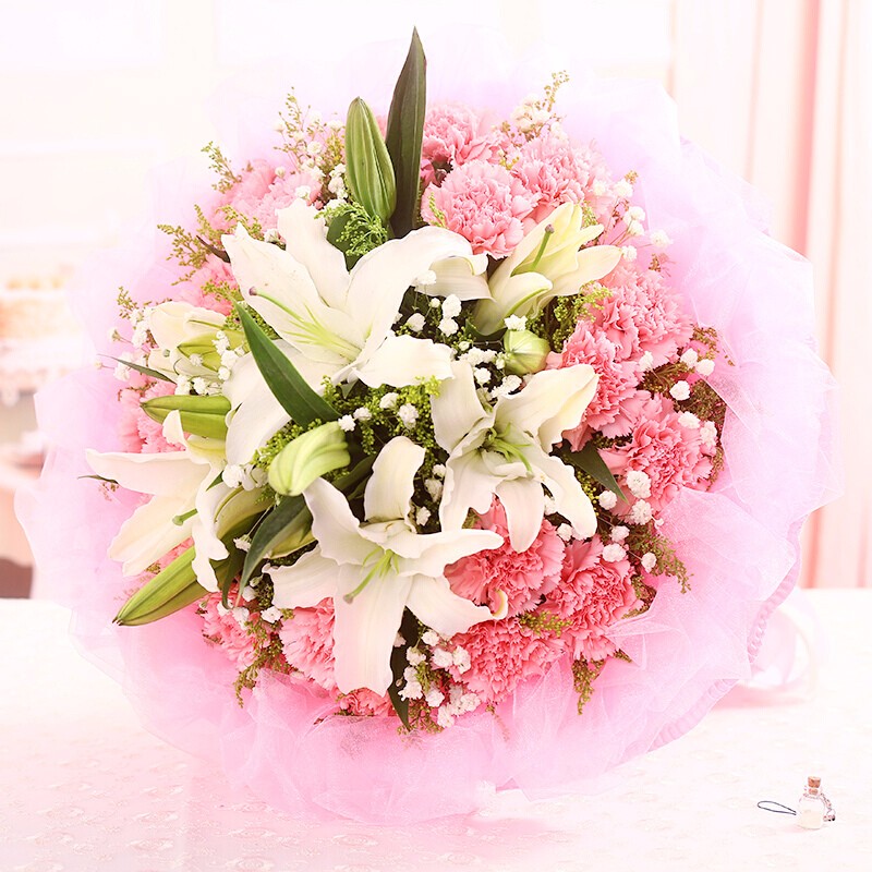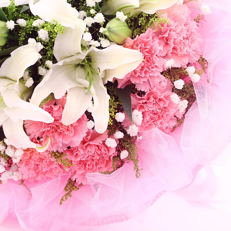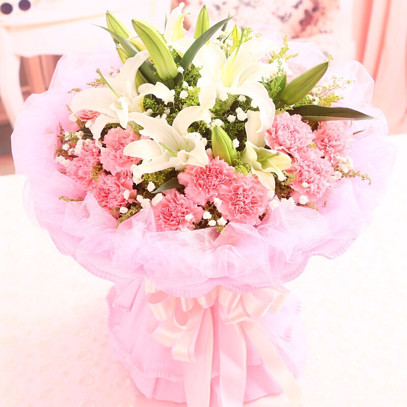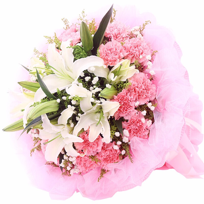 花材: 19支粉色康乃馨,3支白色多头香水百合,搭配满天星装饰。