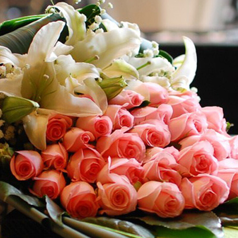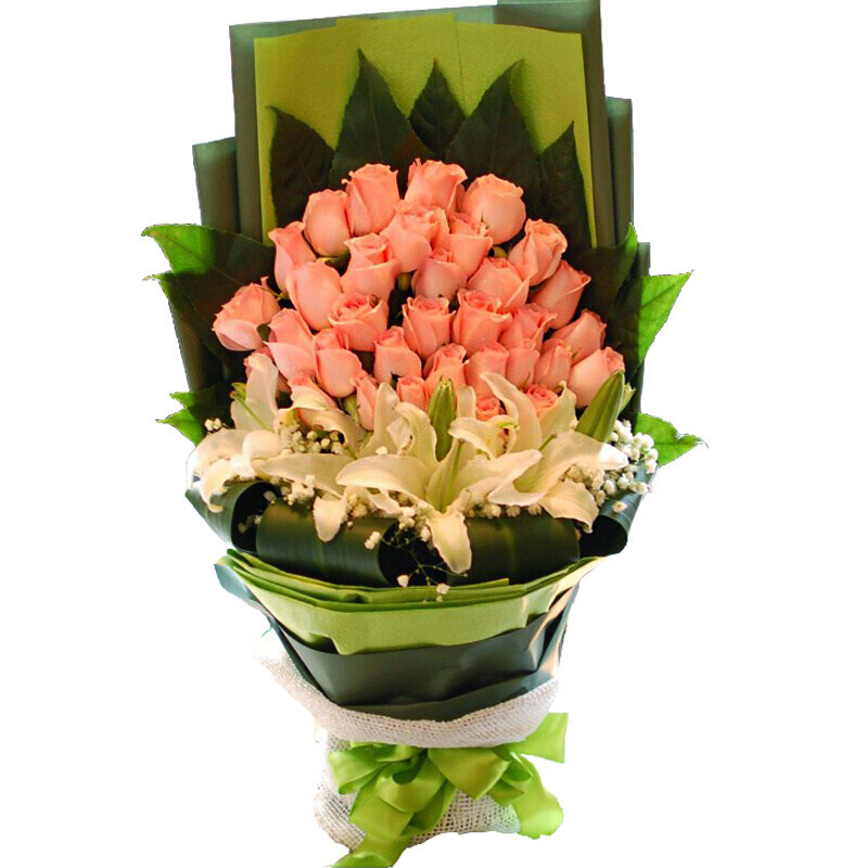花 材:33支精品粉玫瑰,5朵白色香水百合,搭配黄莺、巴西叶装饰。