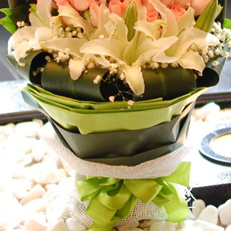 包 装:双色硬面纸双层包扎成扇形花束,绿色丝带系结。
