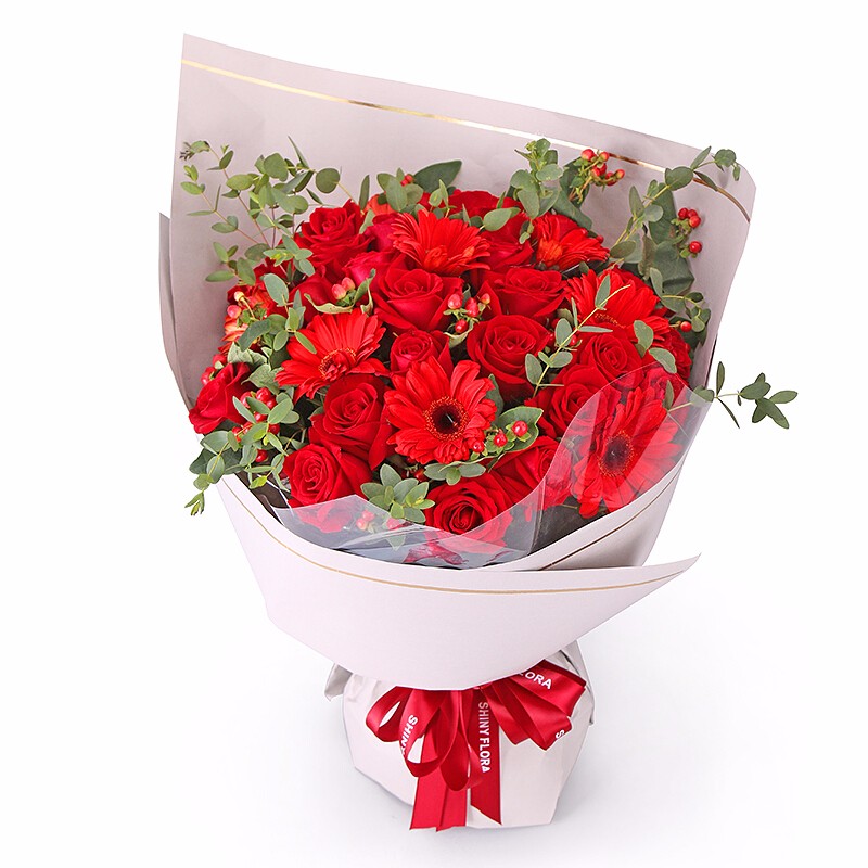 花 材:精选33朵红玫瑰,6支红色太阳花,火龙珠、尤加利尖叶装饰。