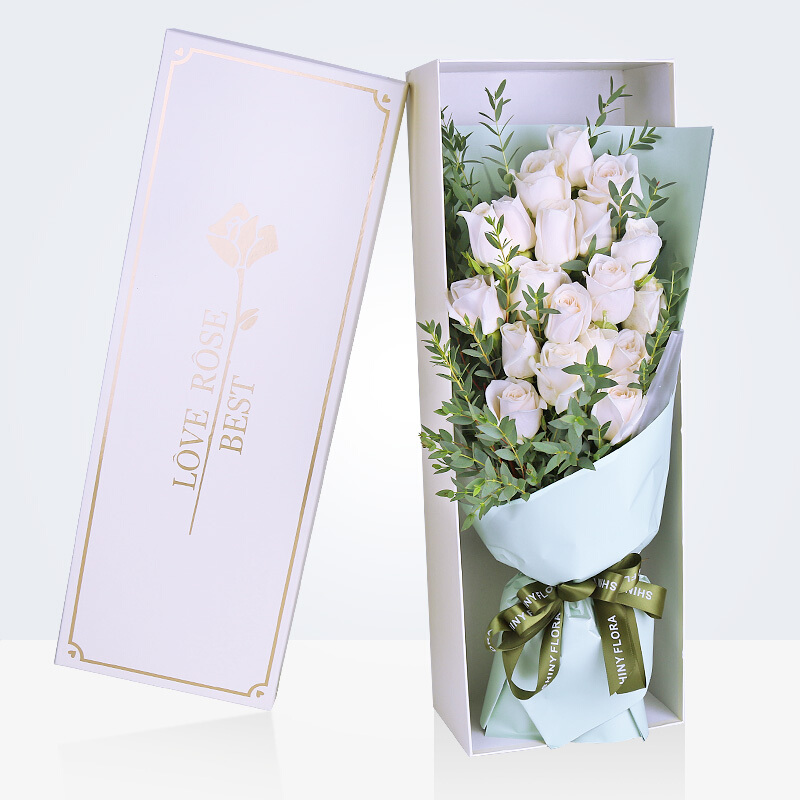 花材: 19朵顶级白玫瑰,尤加利尖叶装饰。