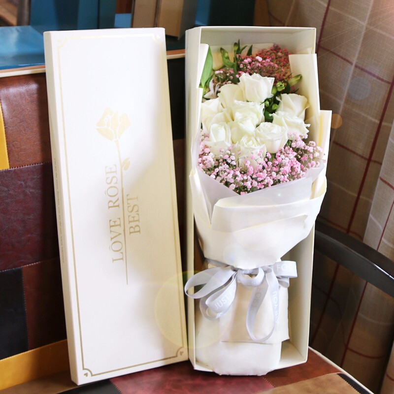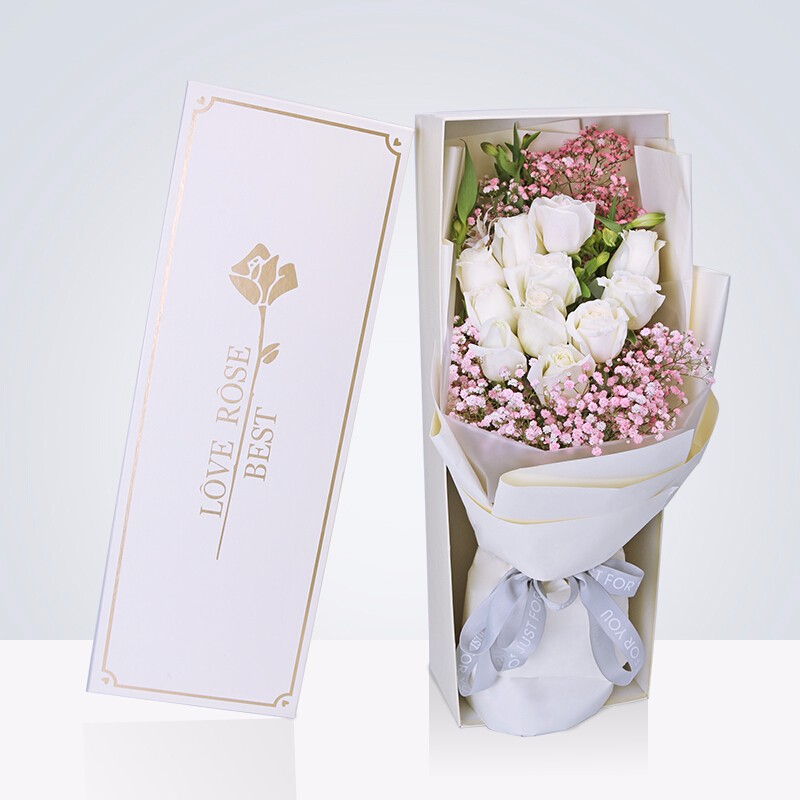 花 材:19朵顶级白玫瑰,搭配进口粉色满天星,绿叶装饰。