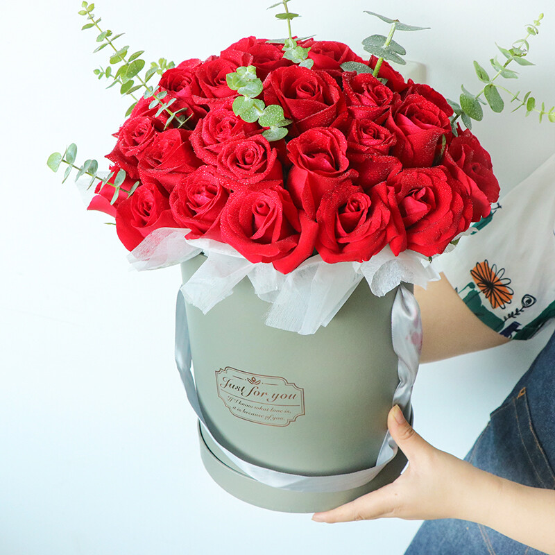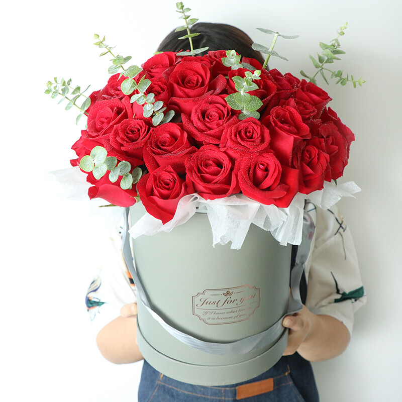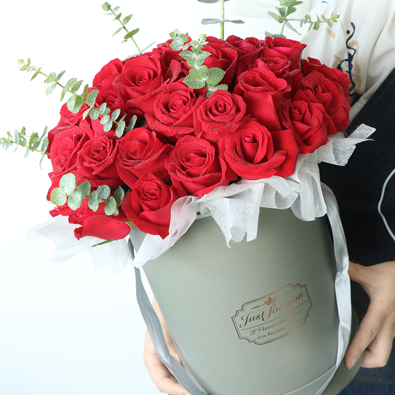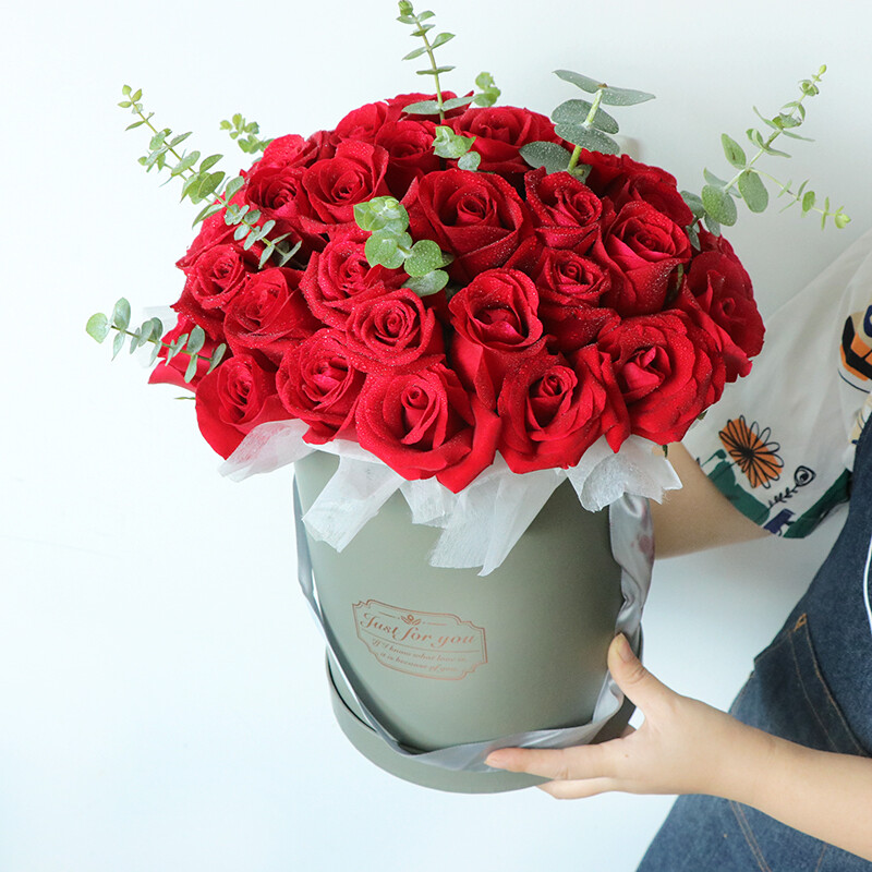 花材: 33朵精品红玫瑰,尤加利叶,绿叶装饰。