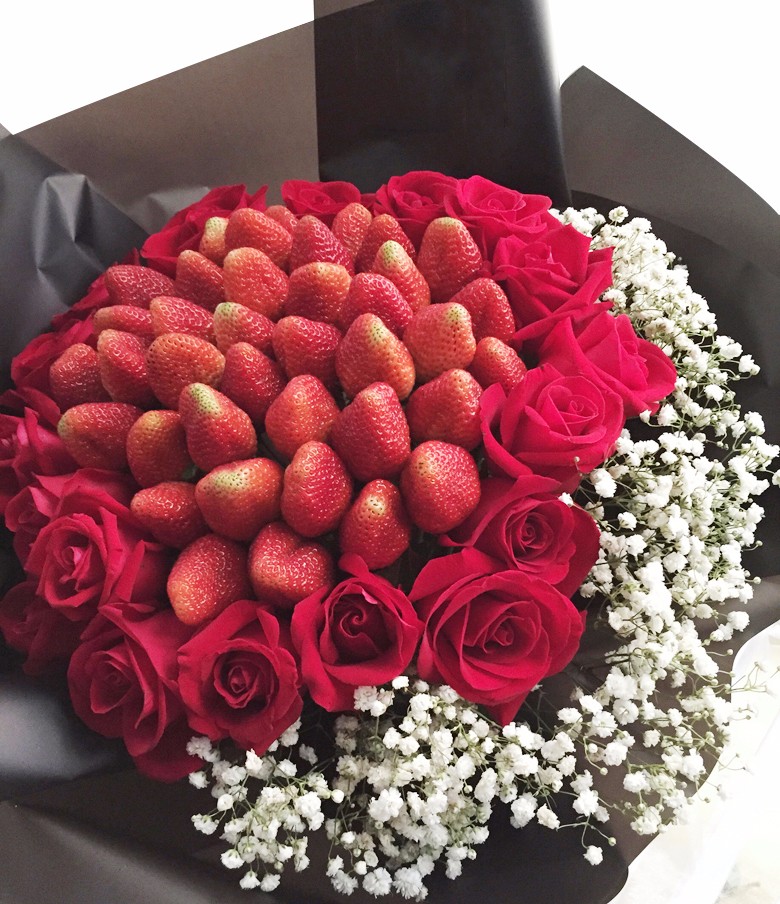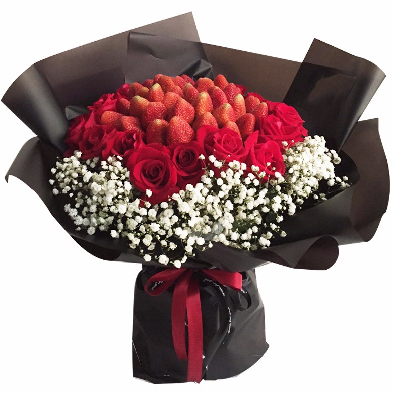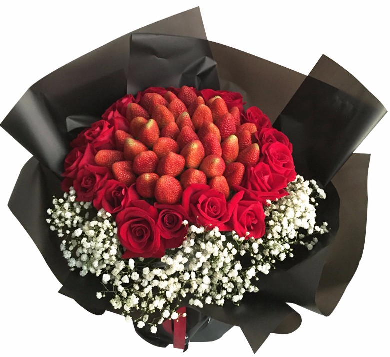 花 材:19朵红玫瑰+35颗新鲜草莓,搭配适量白色满天星装饰。(请至少提前1-3天订购,或订购前咨询客服,谢谢)