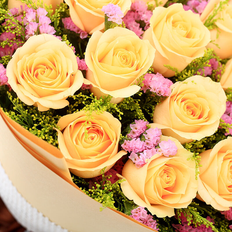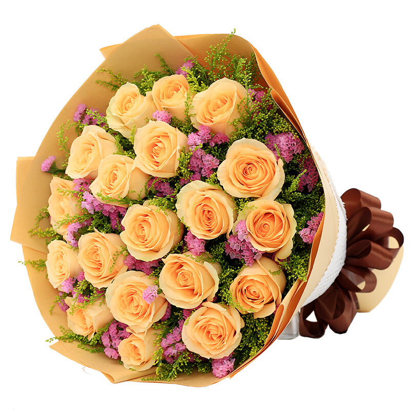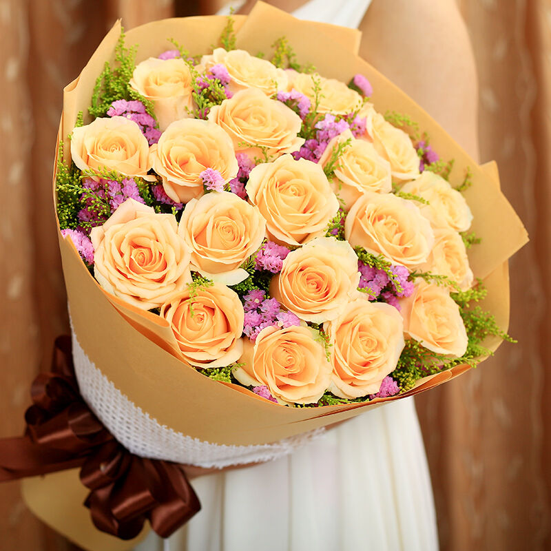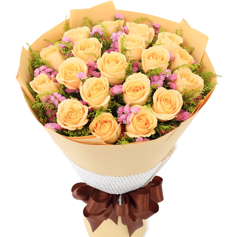花材: 19支精品香槟玫瑰,搭配适量粉色勿忘我、黄莺间插。