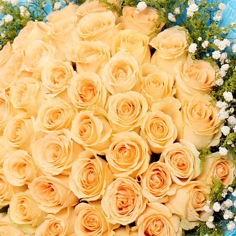 花 材:66支顶级香槟玫瑰,黄莺、满天星围绕。