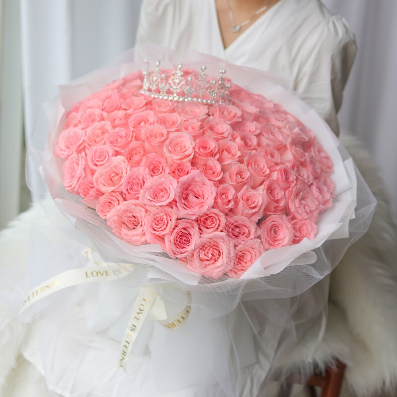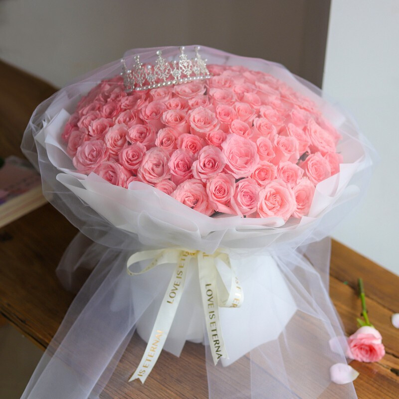 花材: 99朵粉玫瑰,搭配皇冠装饰。