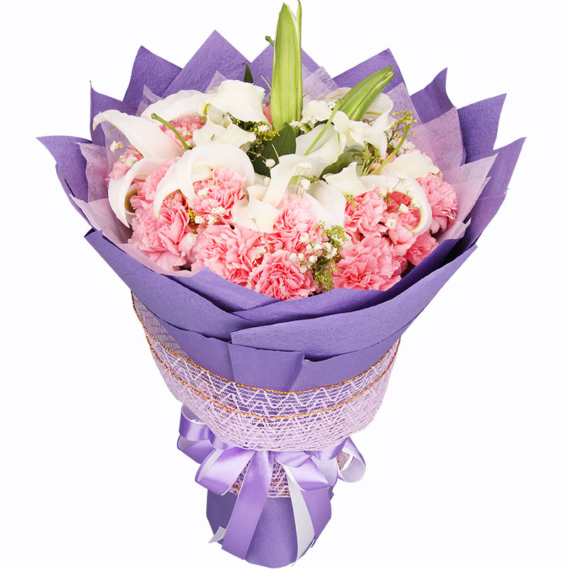 花材: 19朵粉色康乃馨,6朵香水白百合,搭配满天星、黄莺穿插点缀。