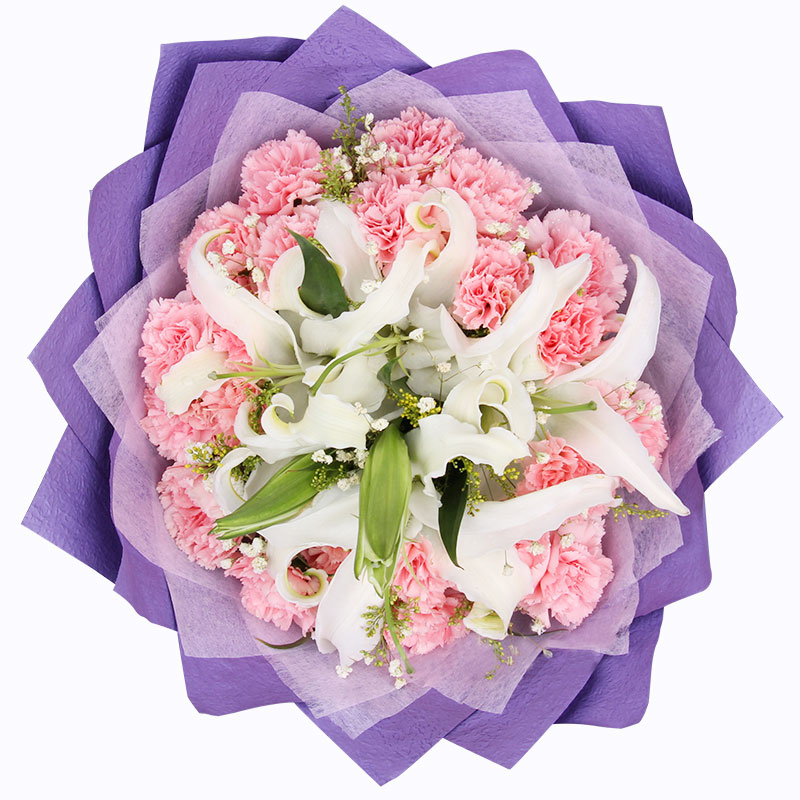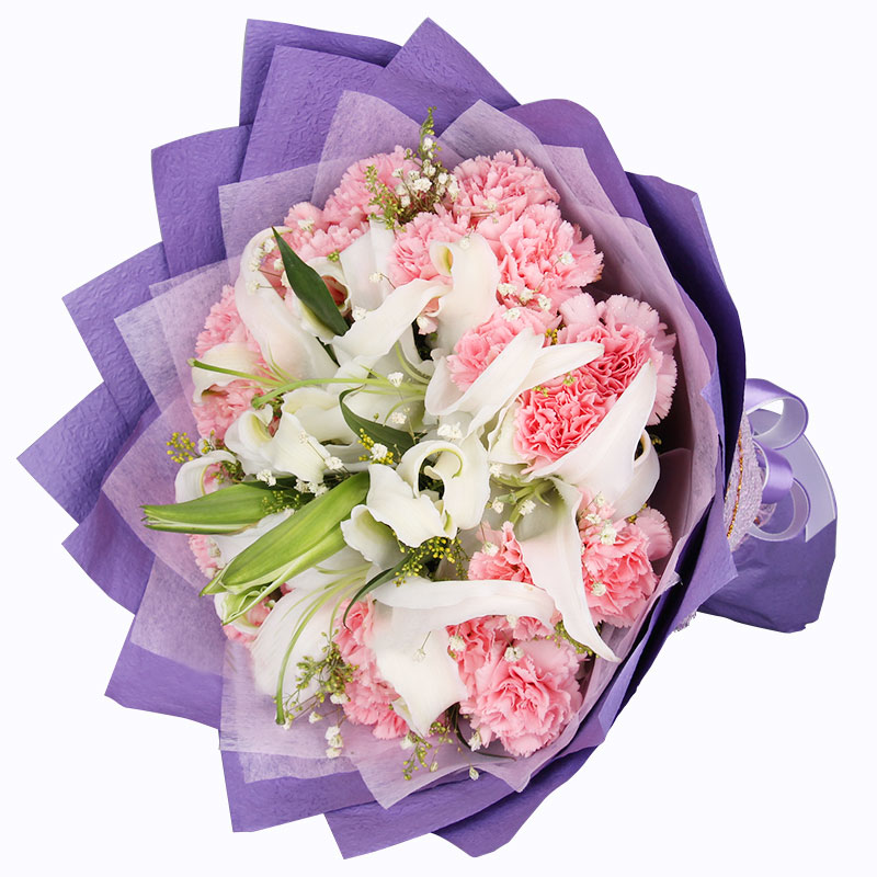 花 材:19朵粉色康乃馨,6朵香水白百合,搭配满天星、黄莺穿插点缀。