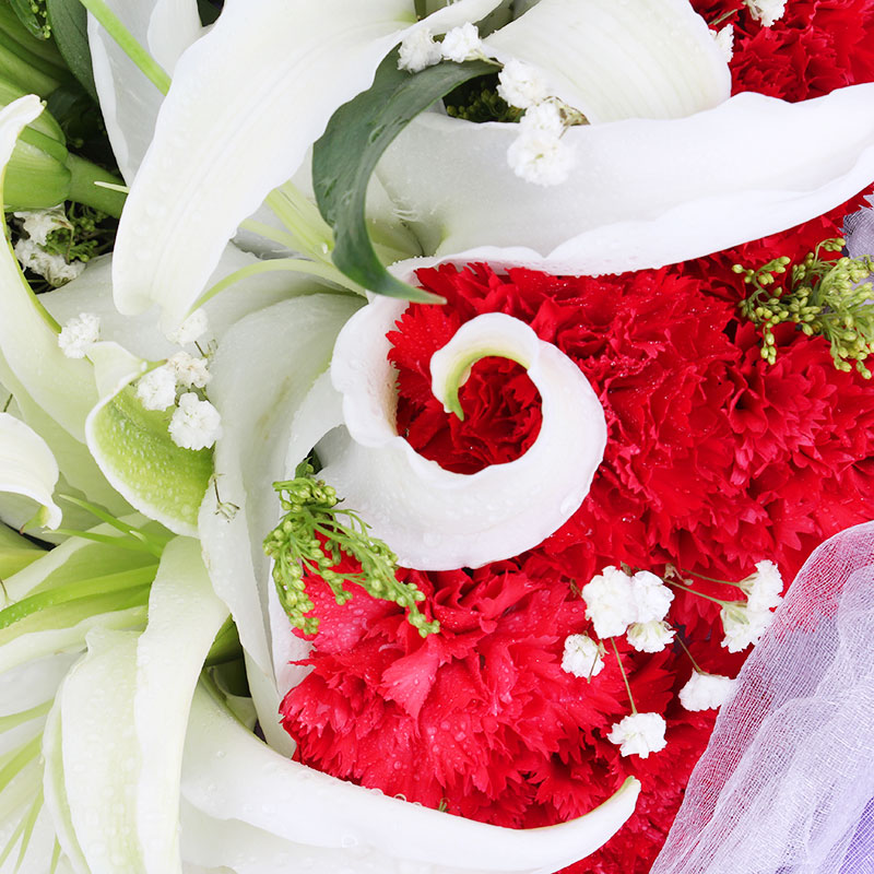 花材: 19朵红色康乃馨,2枝香水白百合,搭配满天星、黄莺点缀。