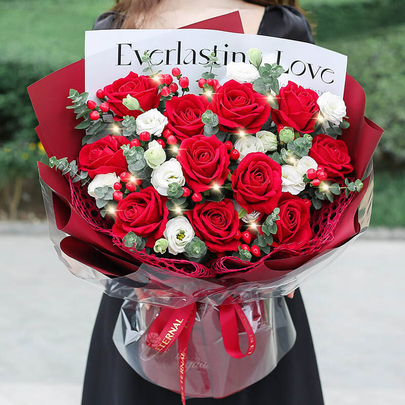 花 材:精选11朵红玫瑰,5支洋桔梗,1条灯串,搭配红豆、尤加利叶装饰。