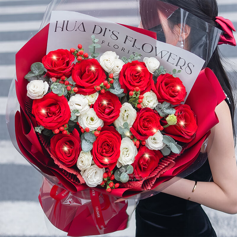 包 装:白色纸内搭,红色纸外包,最外层玻璃纸装饰,红色英文缎带花结。