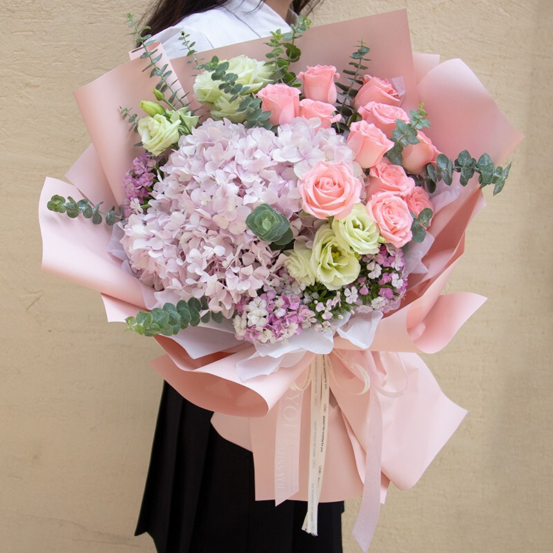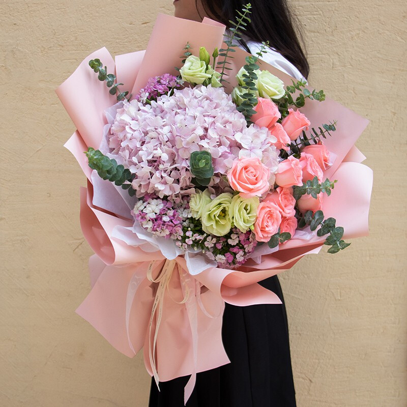 花 材:1支粉色绣球花,11朵粉玫瑰,搭配3支洋桔梗,石竹梅,尤加利叶装饰。