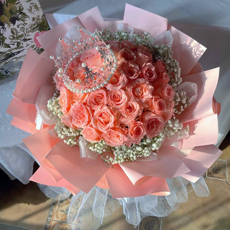 花 材:33朵粉玫瑰,1个皇冠(款式随机),搭配满天星环绕。