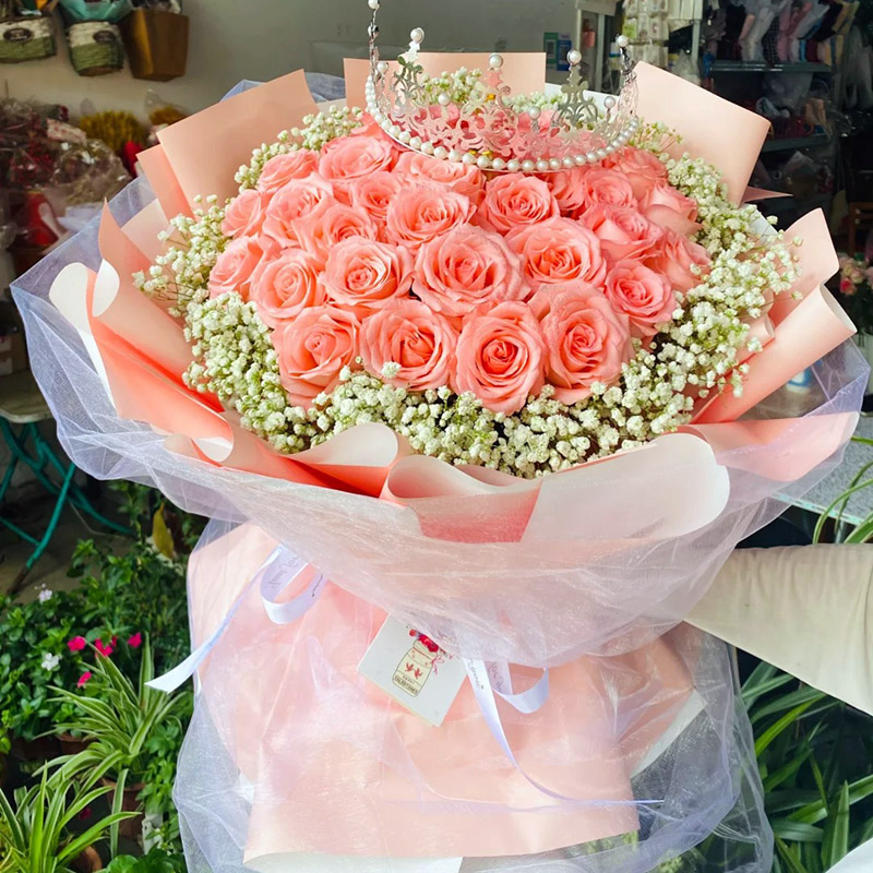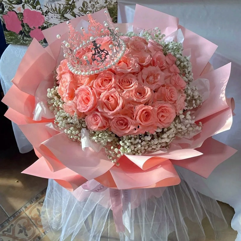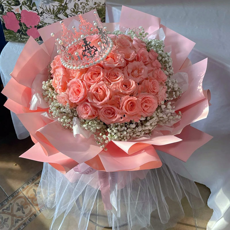 花材: 33朵粉玫瑰,1个皇冠(款式随机),搭配满天星环绕。