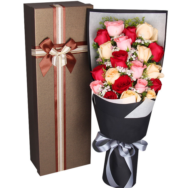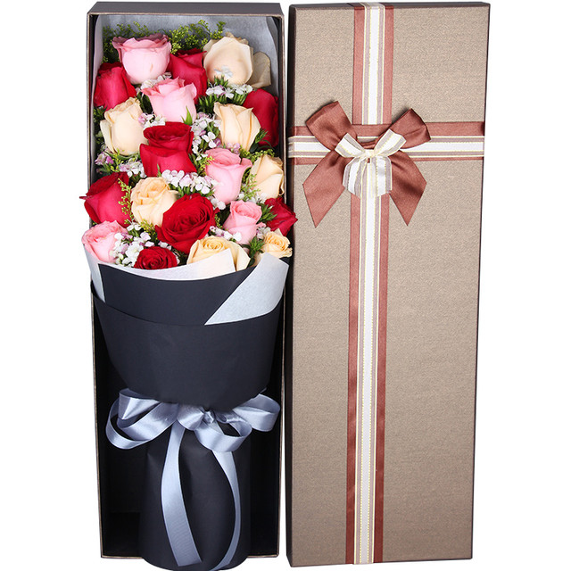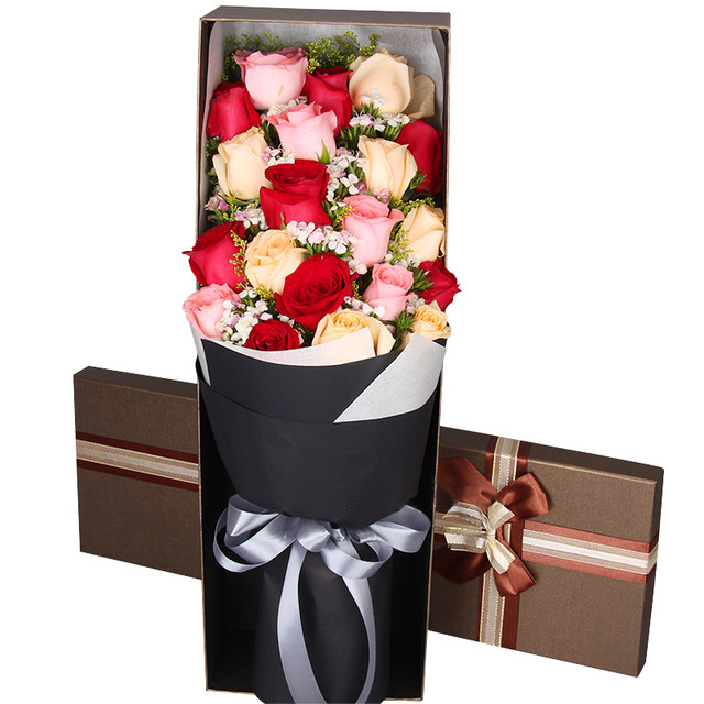 花材: 19朵混色玫瑰(香槟、粉、红),黄莺、相思梅。