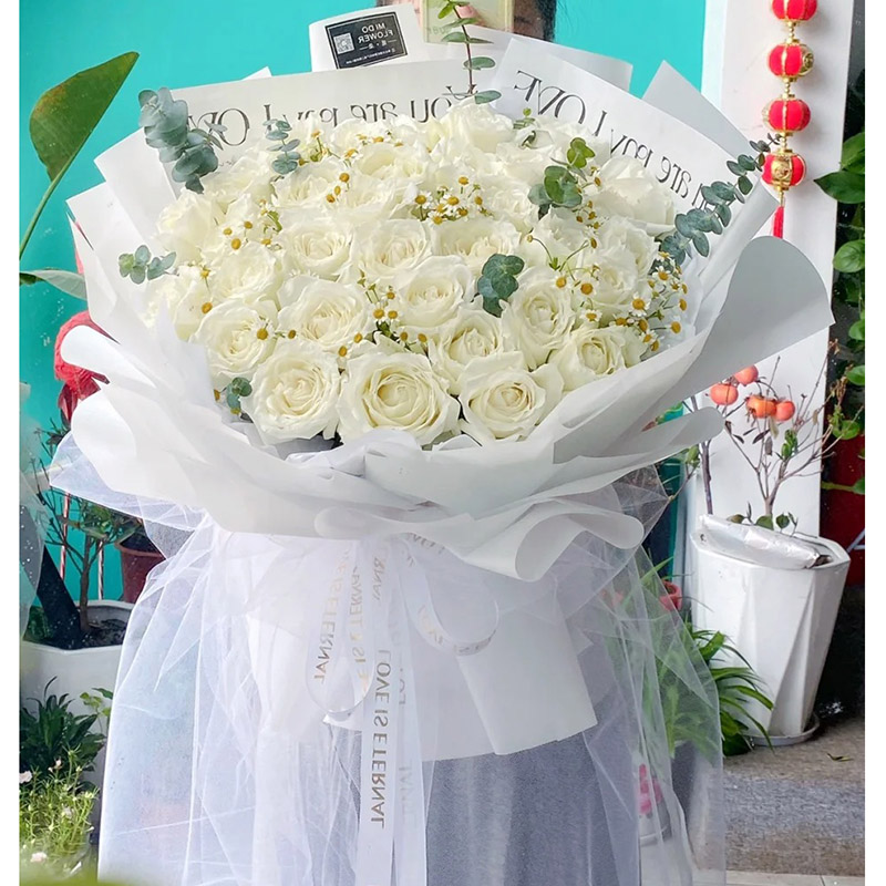 花材: 33朵白玫瑰,搭配洋甘菊,尤加利叶装饰。