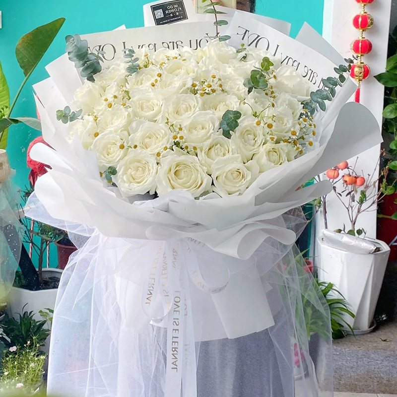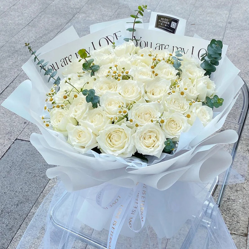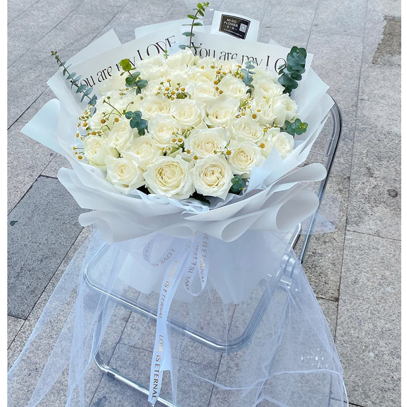 花 材:33朵白玫瑰,搭配洋甘菊,尤加利叶装饰。
