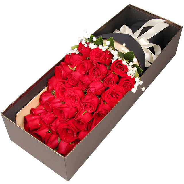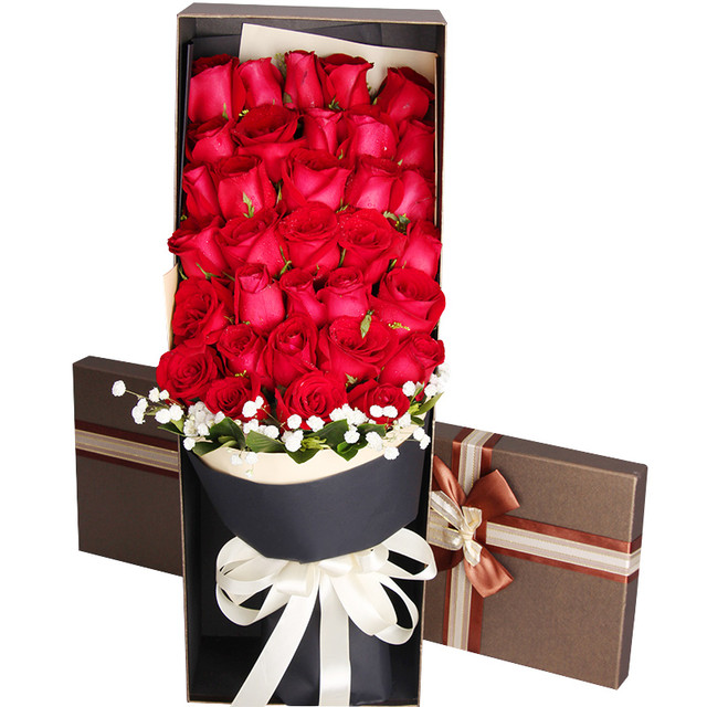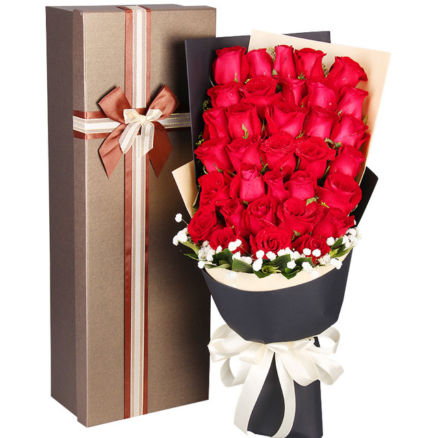 花材: 33朵红玫瑰,搭配栀子叶、满天星。