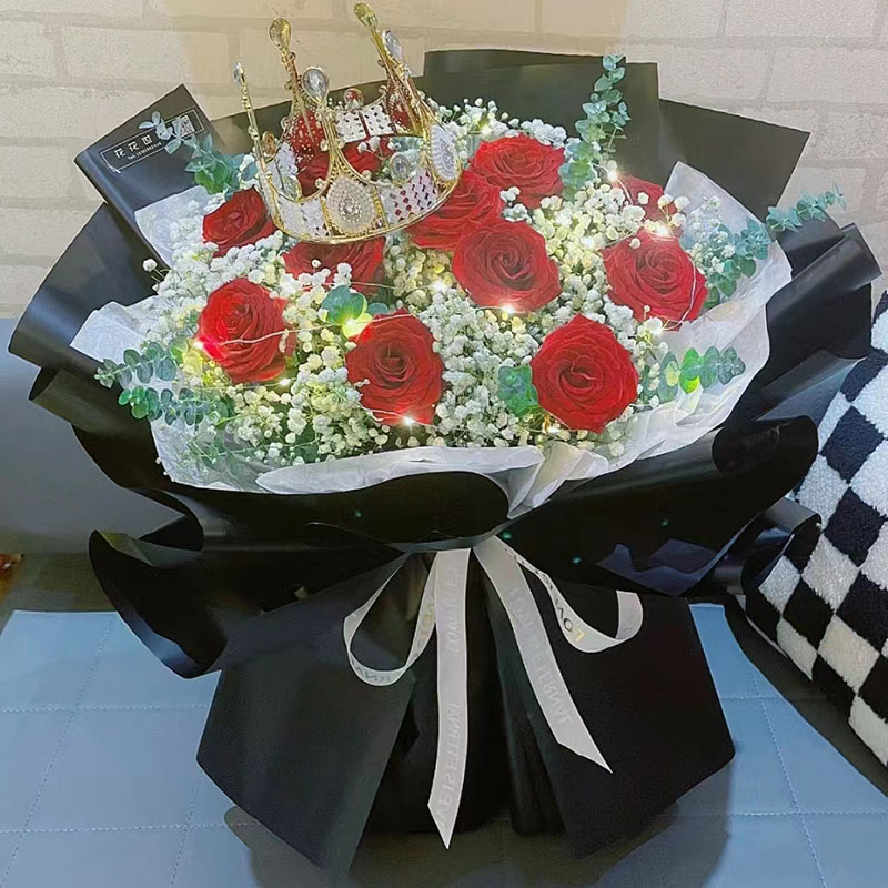 花 材:11朵红玫瑰,1条灯带,1个皇冠(样式随机),搭配满天星、尤加利叶装饰。