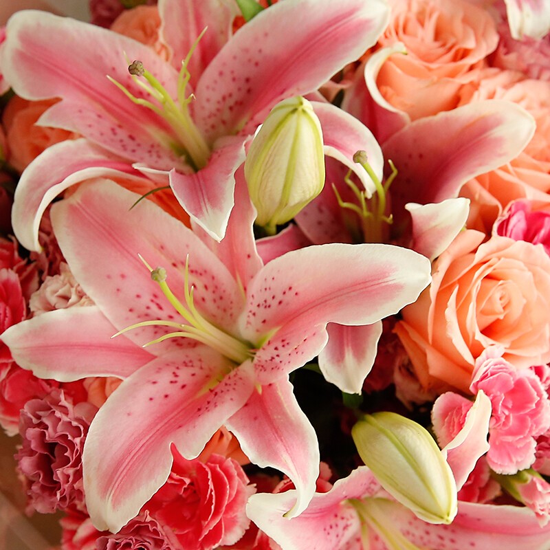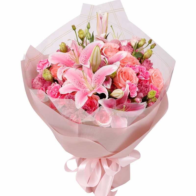 花 材:16支粉康,6支粉玫瑰,3支粉百合,多头粉康、桔梗点缀。