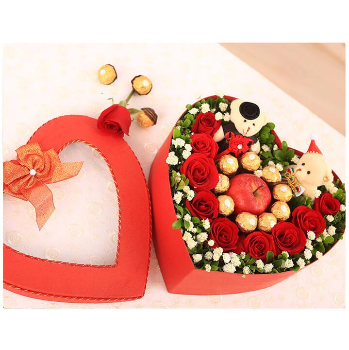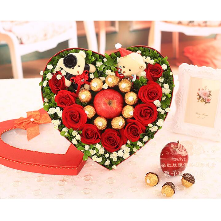 花 材:精选9朵红玫瑰,9颗费列罗,1个苹果,1对情侣小熊,米兰叶、满天星丰满点缀。
