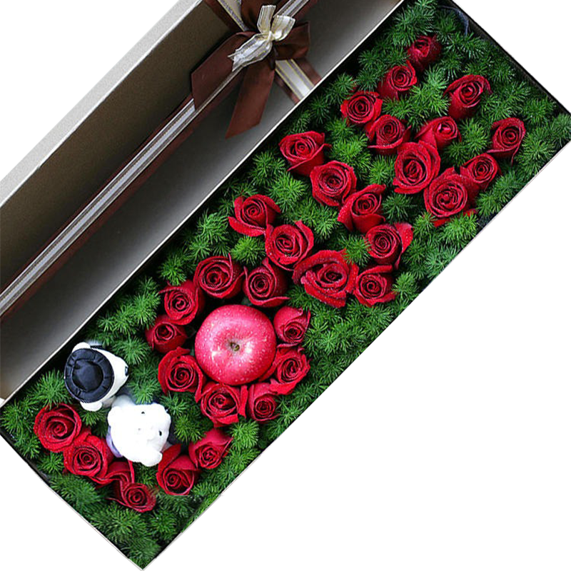 花 材:红苹果1颗、红玫瑰33朵(拼字LOVE)、可爱小熊2只,搭配适量天冬门装饰。