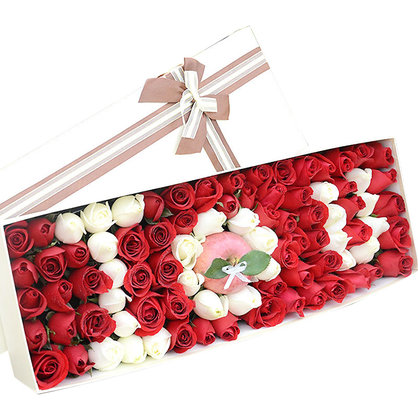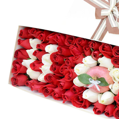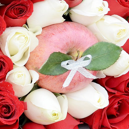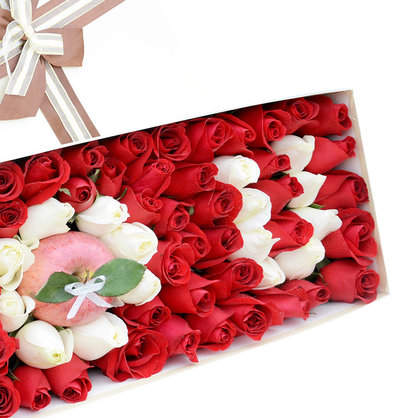 花 材:75朵混色玫瑰(白玫瑰、红玫瑰拼字IOU)、1颗红苹果。