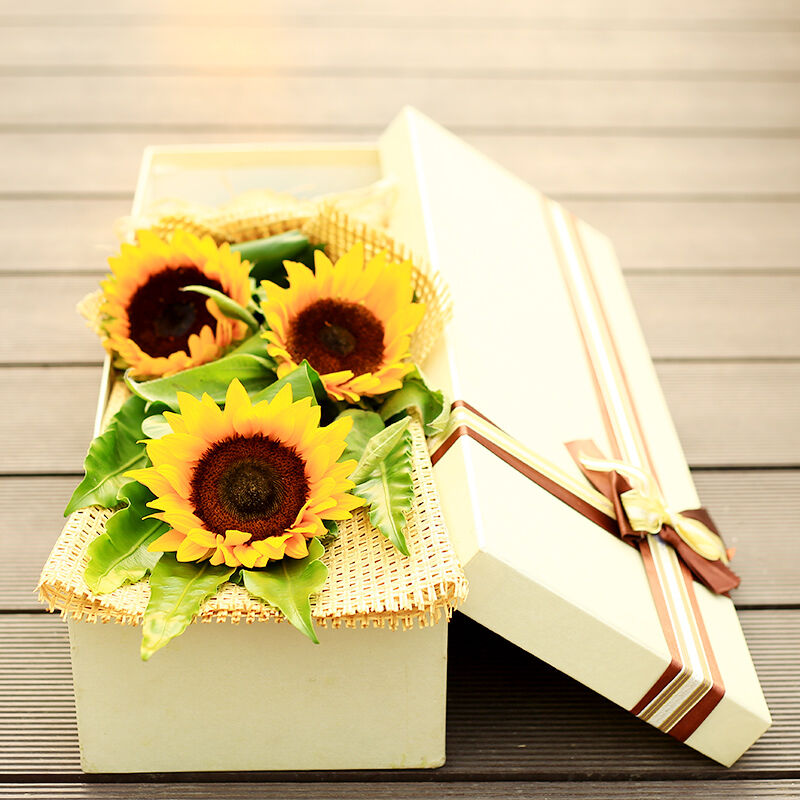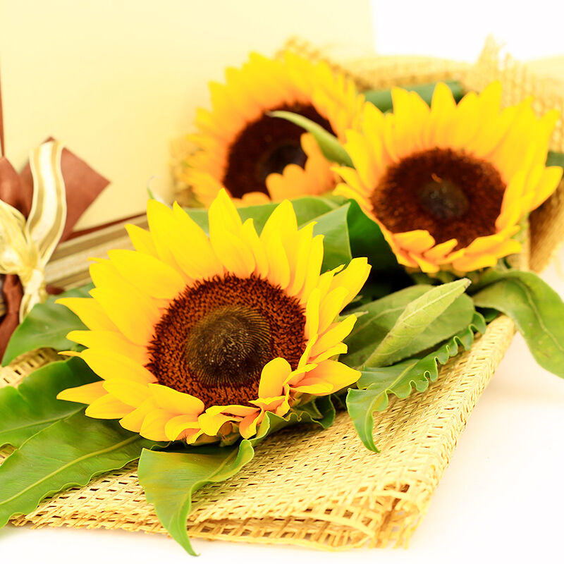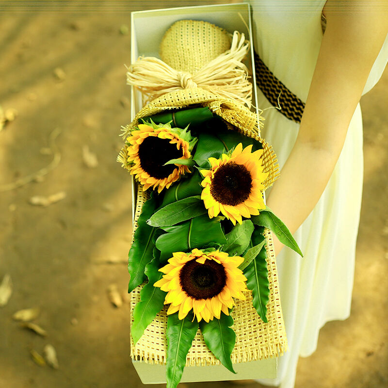 花材: 3支精品向日葵,搭配适量绿叶,拉菲草席内包。
