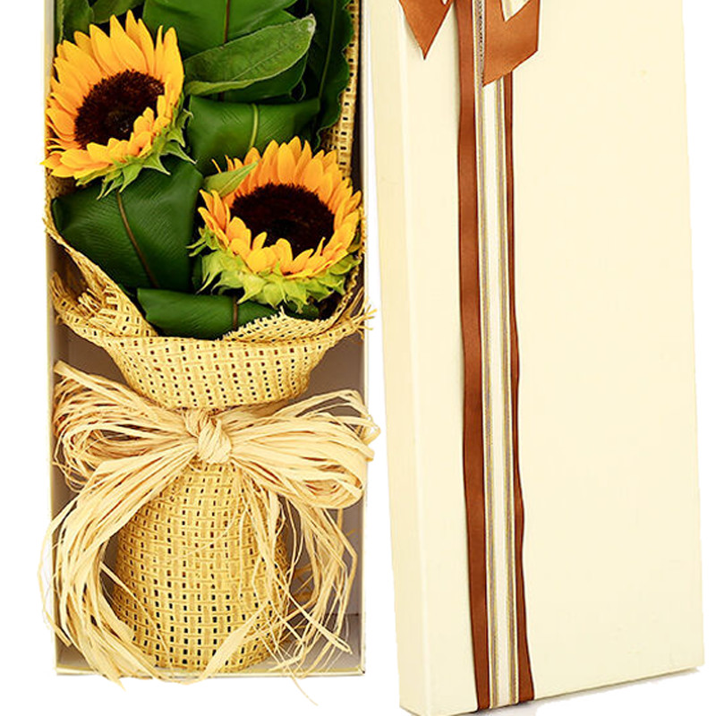 花 材:3支精品向日葵,搭配适量绿叶,拉菲草席内包。
