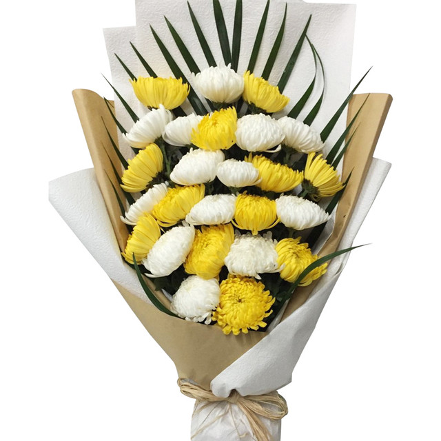 花材: 13朵白菊花,12朵黄菊花,散尾葵、绿叶搭配。