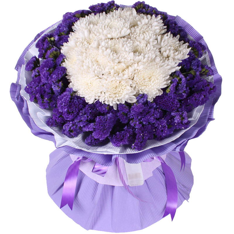 花 材:19支精品白菊花,外围搭配适量紫色勿忘我(或紫色满天星)环绕。