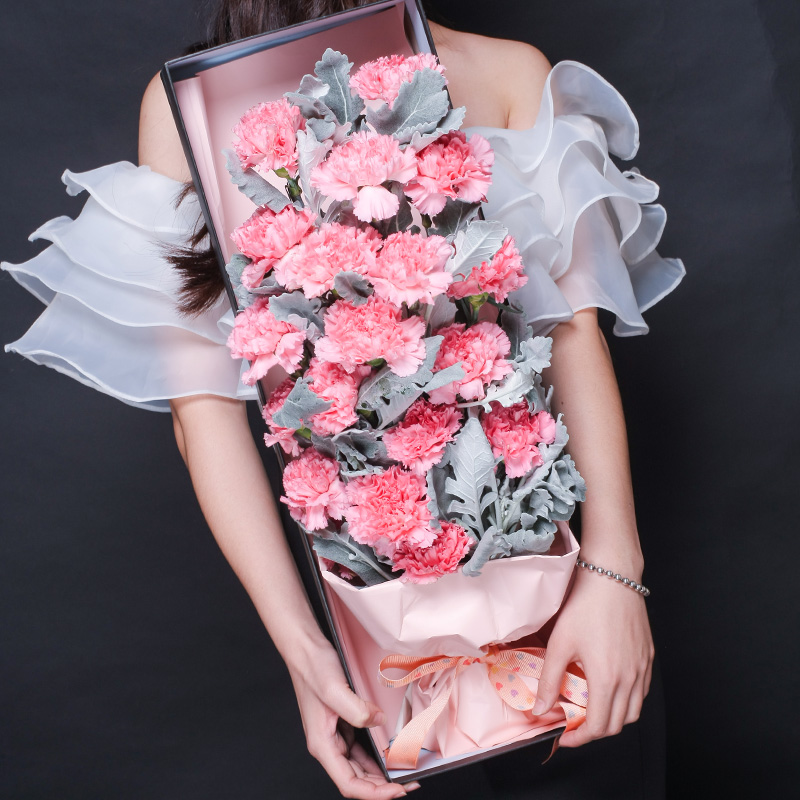花材: 19支粉色康乃馨,搭配适量银叶菊间插装饰。